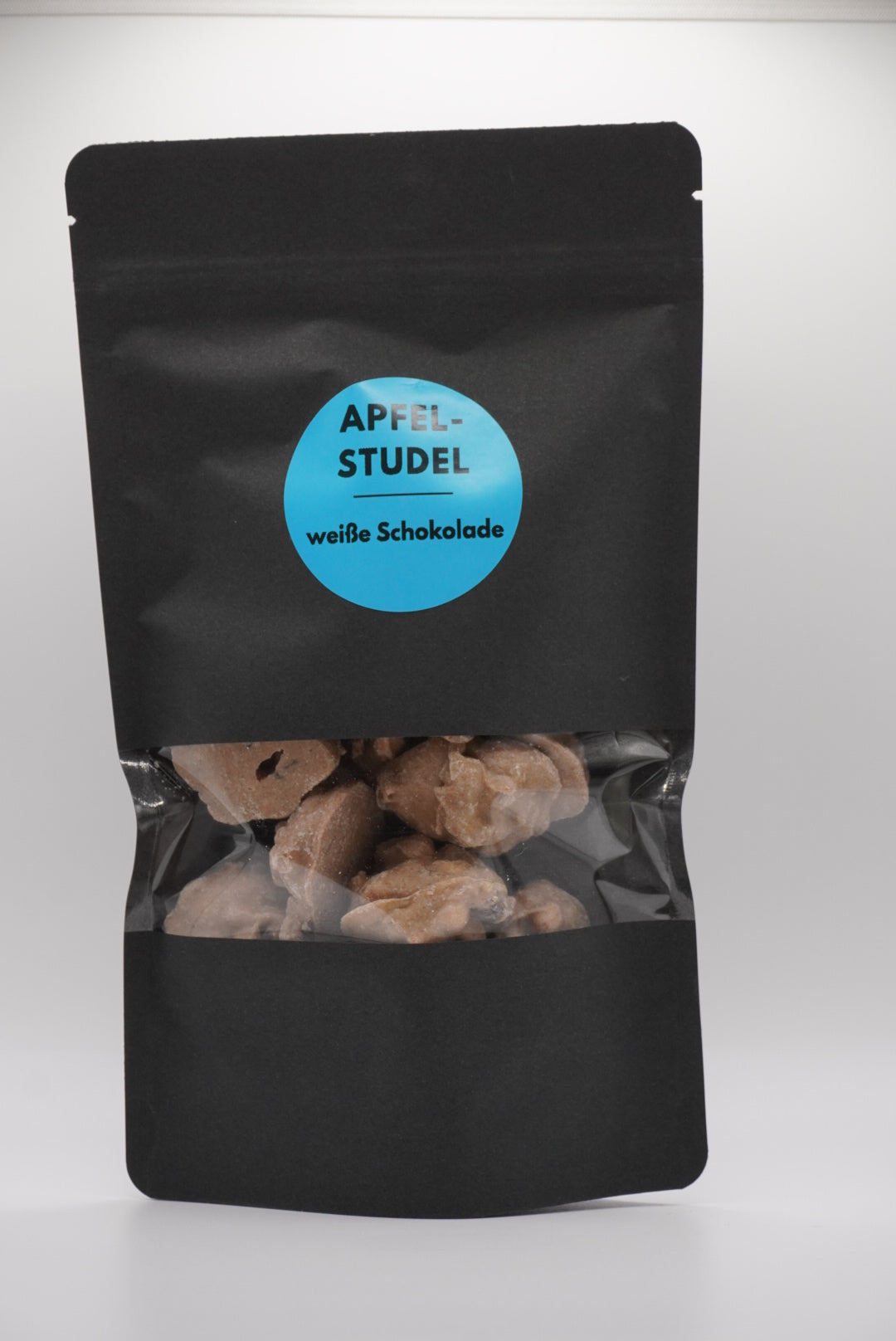 Wie ein Stück Apfelstrudel in Schokoladenform: Unsere Apfelstrudel-Schokolade kombiniert cremige weiße Schokolade mit fruchtigen Apfelstücken, süßen Weinbeeren, knusprigen Keksstückchen und einem Hauch Zimt. Ein winterlich-süßer Genuss mit nostalgischem Wohlfühlcharakter.