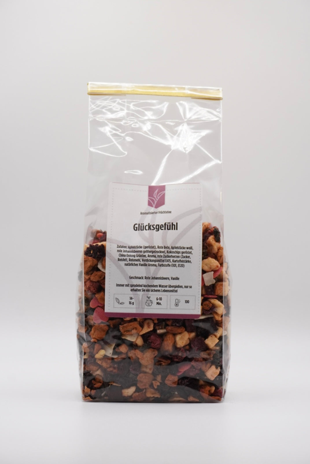 Zutaten: Apfelstücke (geröstet), Rote Bete, Apfelstücke weiß, rote Johannisbeeren gefriergetrocknet, Kokoschips geröstet, China Oolong Grüntee, Aroma, rote Zuckerherzen (Zucker, Reisfett, Reismehl, Verdickungsmittel E415, Kartoffelstärke, natürliches Vanille Aroma, Farbstoffe E101, E120)