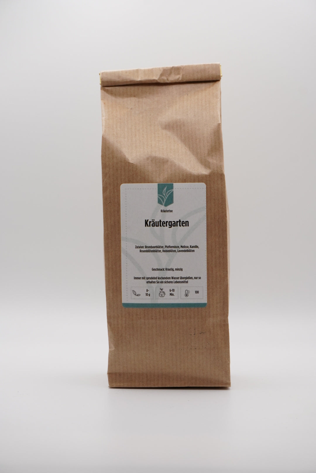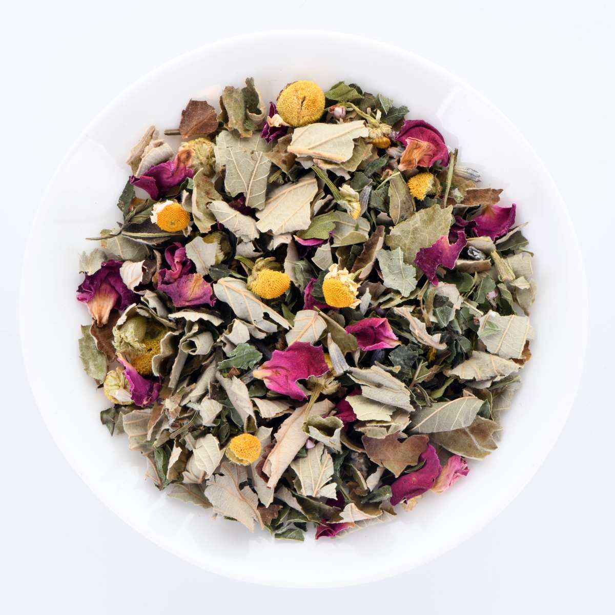 Zutaten: Brombeerblätter, Pfefferminze, Melisse, Kamille, Rosenblütenblätter, Heideblüten, Lavendelblüten