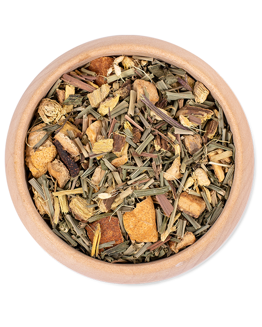 Zutaten: Lemongras, Ingwer, Zitronenschalen, Süßholz, Pfefferminze, Schwarzer Pfeffer
