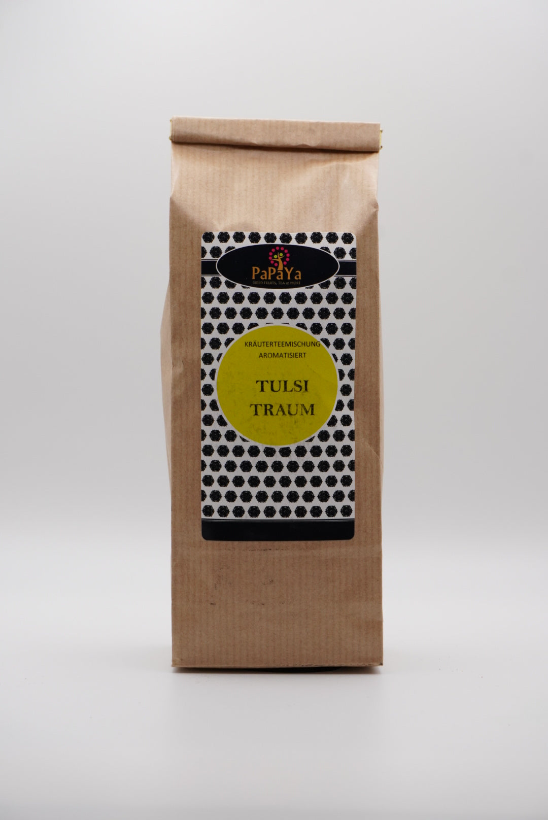 Zutaten: Tulsi-Kraut, Brombeerblätter, Kamillenblüten, Erdbeerblätter, Pfefferminzkraut, Heidelbeerblätter, Melissenkraut, Hibiskusblüten, Lindenblüten, Anis, Birkenblätter, Ringelblumenblüten, Heidekraut, Fenchel, Hopfen.