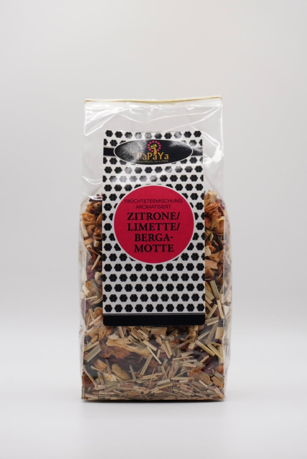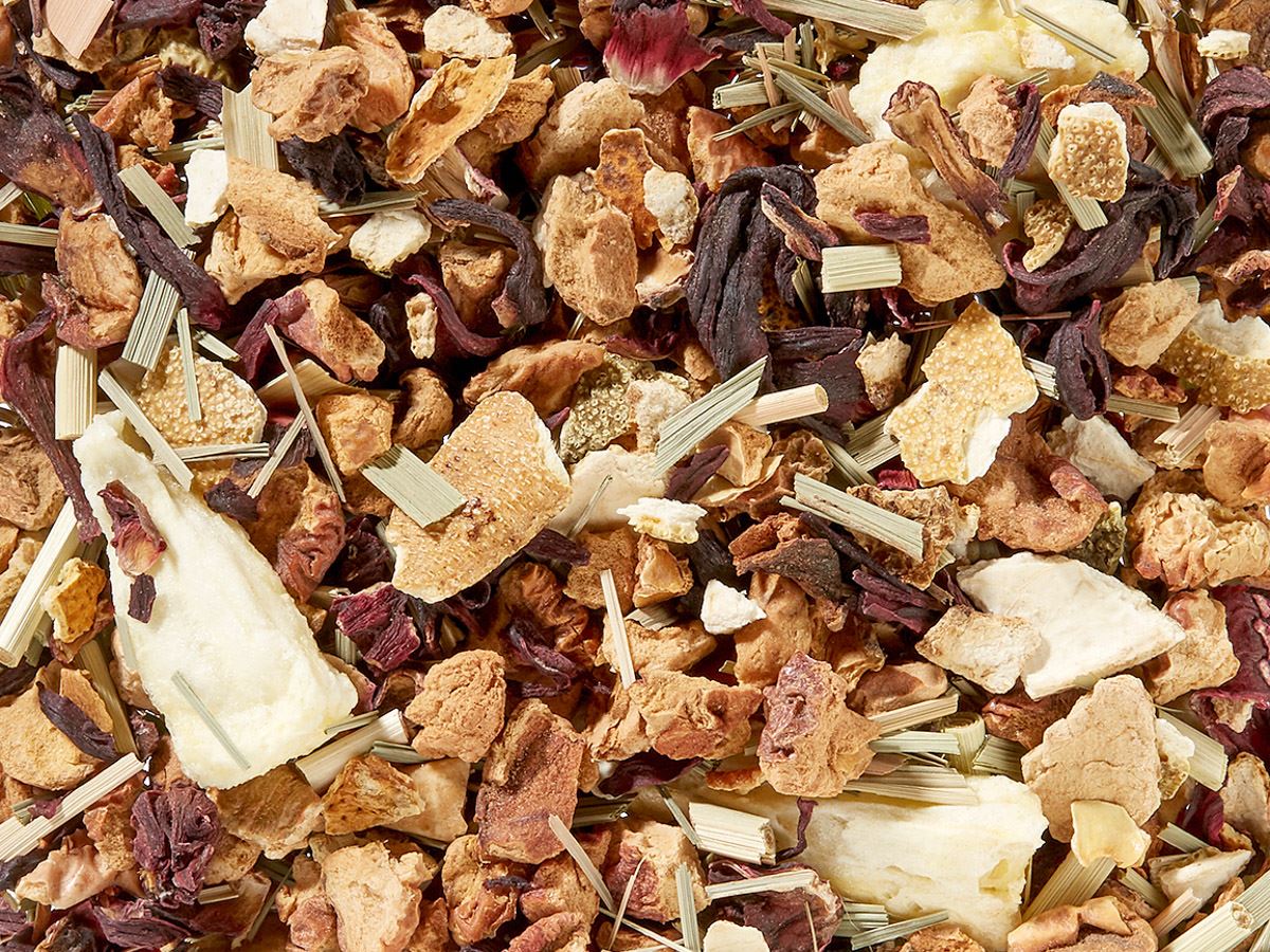 Zutaten: Apfelstücke*, Hibiskusblüten *, Zitronengras*, Orangenschalen*, Zitronenschalen*, gefr.-getr. Ananasflocken*, Limettenöl*, Lemongrasöl*, Zitronenöl*, Bergamotteöl*, *k.b.A. - aus kontrolliert biologischem Anbau.